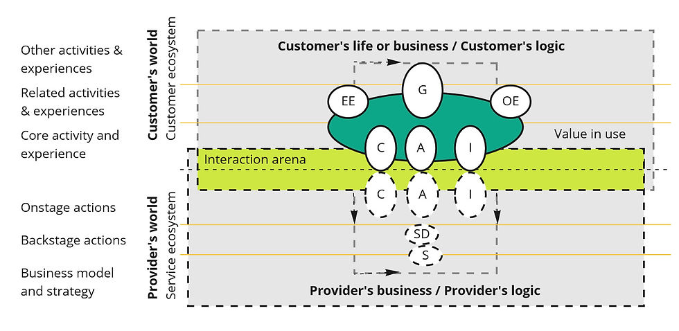 Heinosen ja kumppaneiden (2010) mukaan, arvon muodostuminen ulottuu paljon kauemmas, kuin vain vuorovaikutustilaan yrityksen kanssa, ja se voi myös muodostua myöhemmin muissa tilanteissa. Tämä vuorovaikutustila muodostuu informaatiosta, aktiviteeteista asiakkaiden kanssa, mitkä voivat olla suoria tai epäsuoria, sekä viestinnästä palveluntoimittajan kanssa, millä on myös tärkeä rooli.